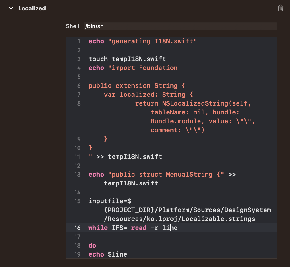 위에 적은 String들은 아래와 같이 Swift에서 사용할 수 있도록, Localization 포맷에 맞게 자동 생성되도록 했는데요.